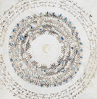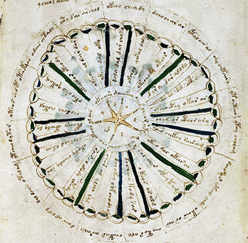 The manuscript’s astrological charts show some similarities to cymatic figures. The charts showing improbable spiral forms may indicate motion, as the combined voices of the singers would be rife with rich phasings (chorusing) which would translate as an unstable, moving cymatic figure, with manifest rotary motions. The symbolic demarcations of some charts might be attempts at macro/microcosmic integration by corresponding the limbs of voice figures with astrological houses.