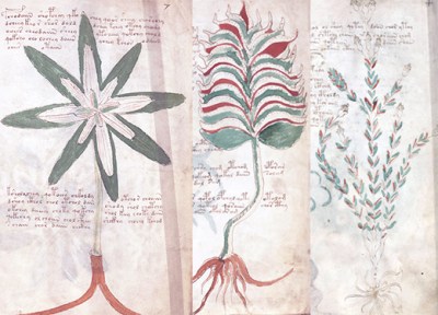 The baffling Voynich Manuscript, written in an apparently indecipherable script, has caused much head-scratching since its rediscovery in 1912. Thought to be of mediaeval origin, it contains quasi-astrological diagrams, depictions of strange devices, plants – unlike any earthly flora – alongside nude figures bathing in complex networks of ‘pools’ featuring recycled water (some mechanisms of which look decidedly unhygienic to modern eyes). Some reckon it to be an alchemical text, whilst others believe it a hoax or an artistic exercise in glyptolalia. Judge for yourself here.