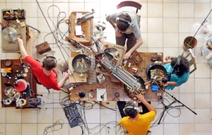 Miraculous agitations are instances of complex sonic progressions, usually emerging from clustered vibrating objects (see previous blogposts for more explanations). Obtaining these emergent states requires patience, but the probability of such states occurring increases with the size of the apparatus. In 2013, Oscillatorial Binnage spent a week at Maggie Thomas and Bob Drake‘s Borde Basse studio in the south of France, loaded up with as many salvaged/adapted objects as we could haul. Over the course of our stay, we gradually coaxed elusive ‘miraculous’ states to emerge from our vibrating apparatuses, not without some grind (Bob, engineering the proceedings, notably had a box of headache tablets on standby).
